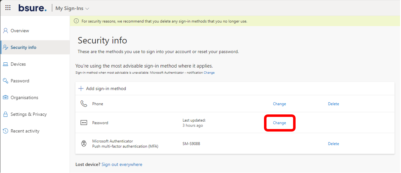 When done, user should set a new password if needed using the link provided on https://mysignins.microsoft.com/security-info