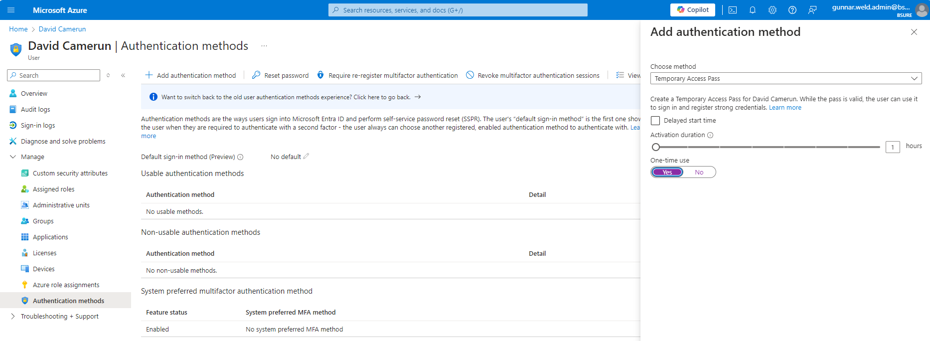 End-user goes to https://aka.ms/mysecurityinfo and type in username and gets asked for temporary access pass: