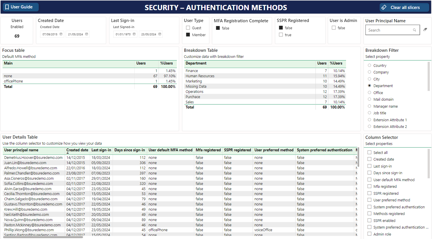 Bsure Insights - Security - Authentication Methods report will list all accounts available for everyone guessing the correct username and password:
