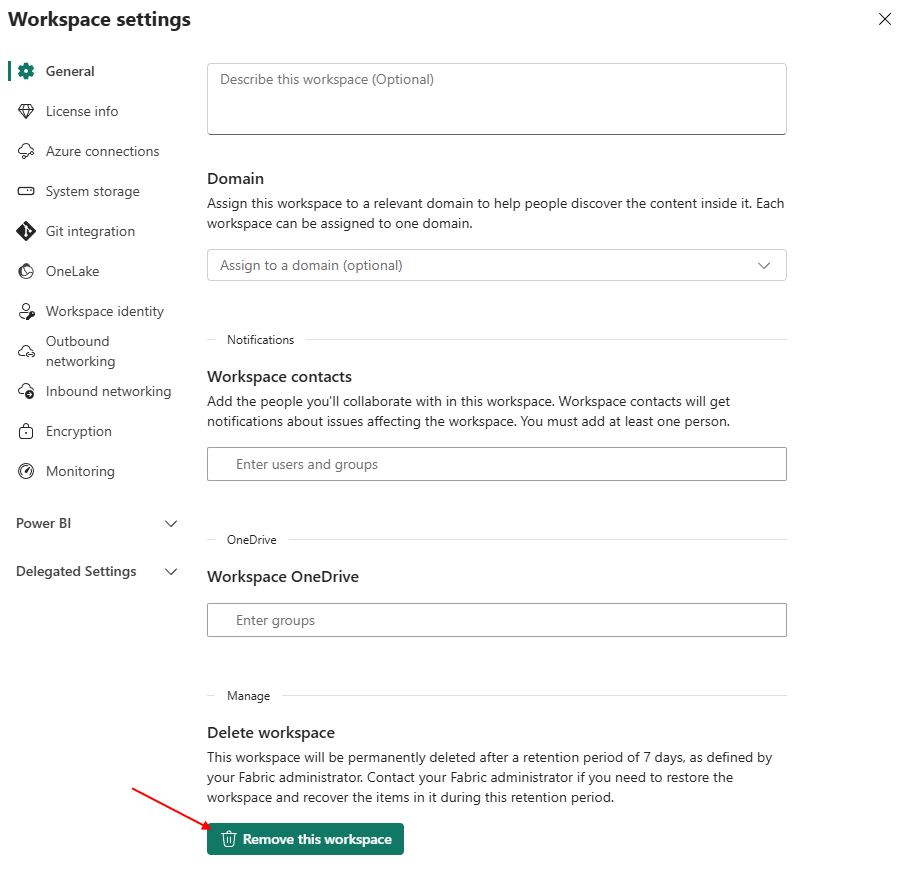 Scroll to the bottom of the General page, and **Remove this workspace**