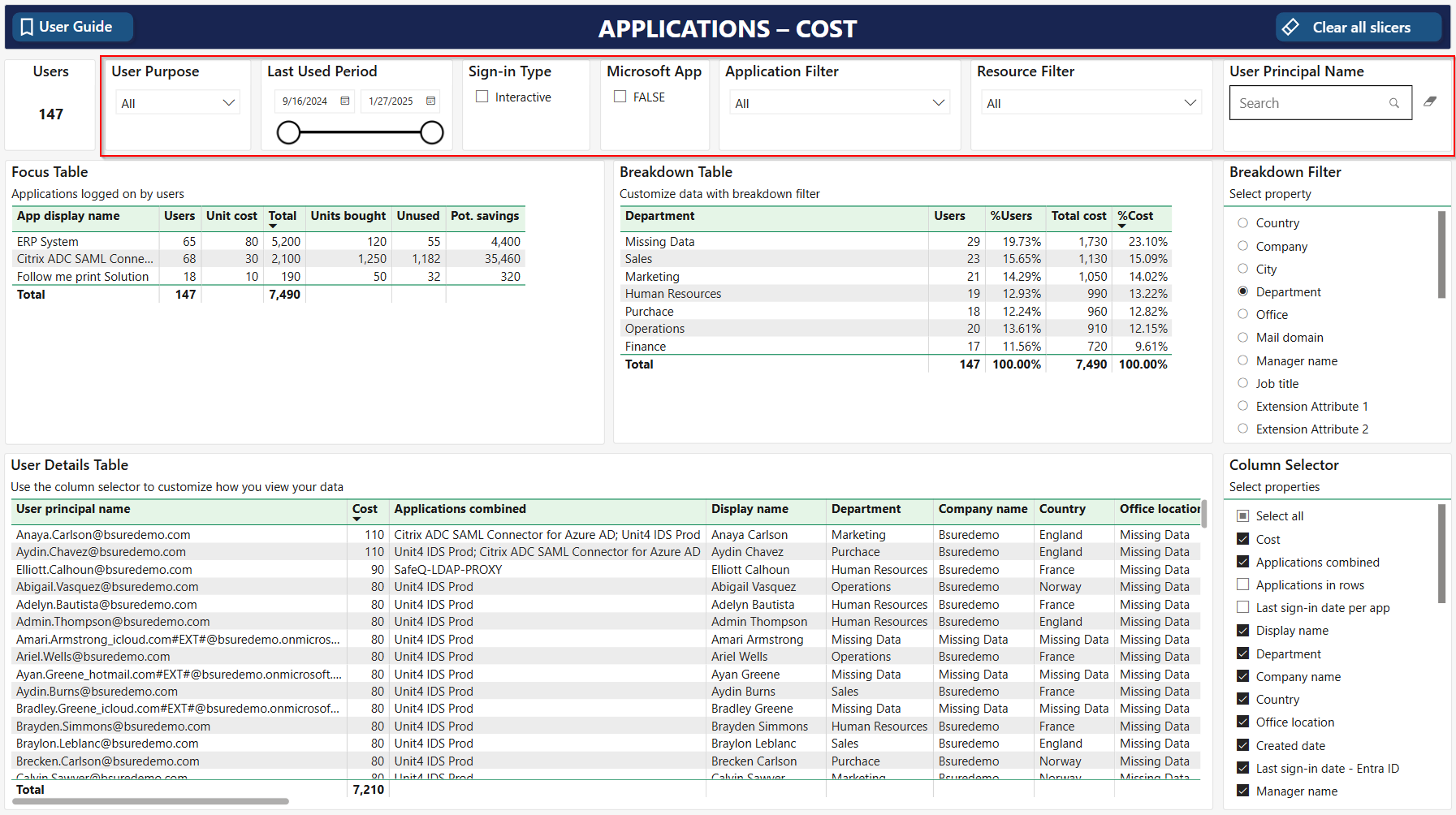 In the application cost report we want you to add a cost and quantity purchased of each application, giving you the chance to leverage cost control for all your SaaS apps with single-sign-on (SSO) through Entra ID. We recommend you to run Bsure for at least 30 days to have enough data to consider whether you have a potential saving on an application.