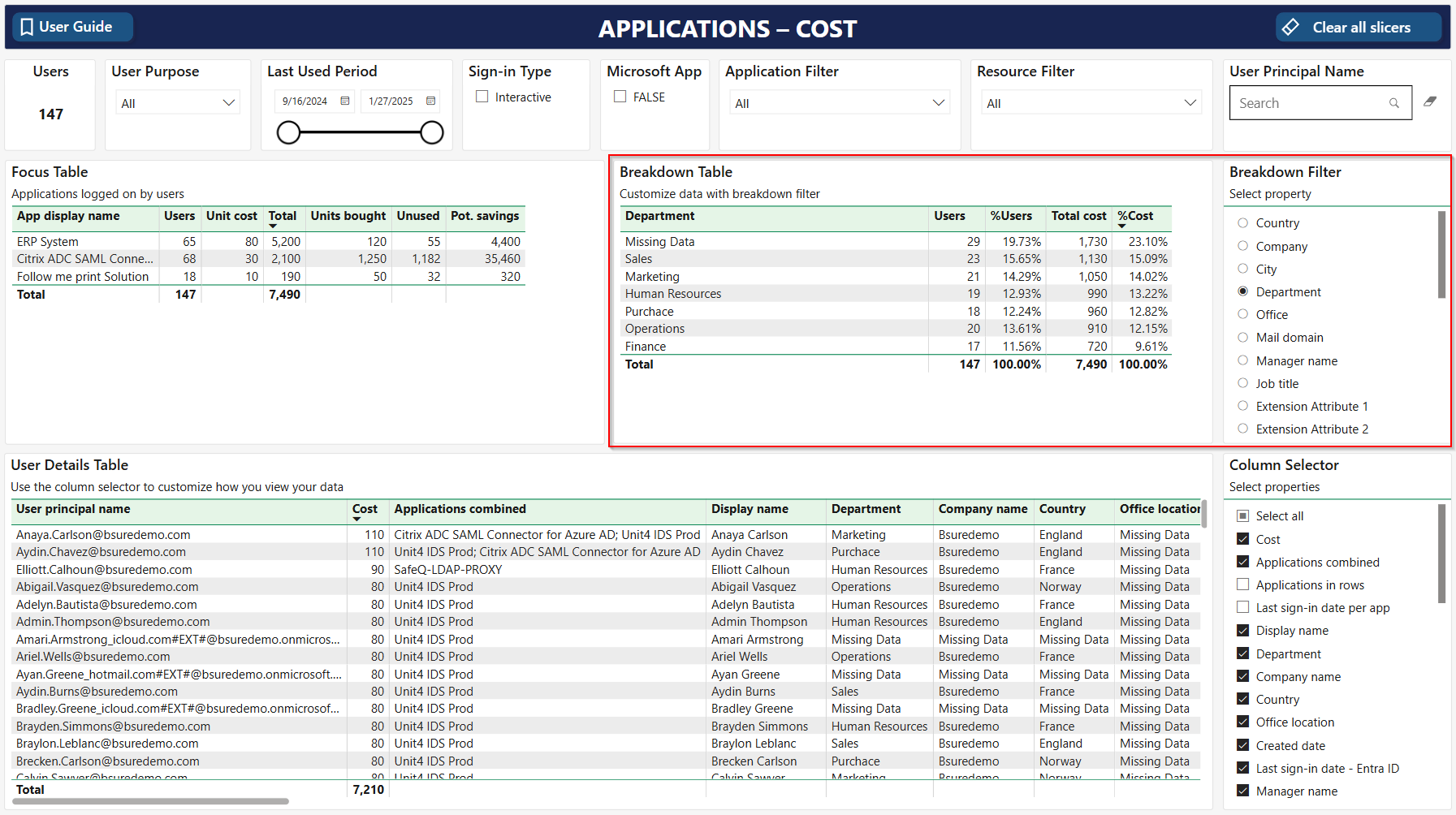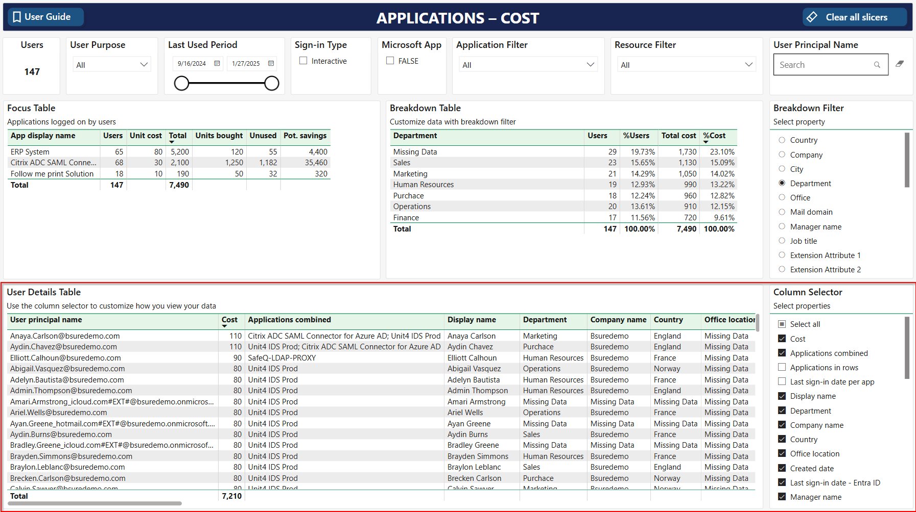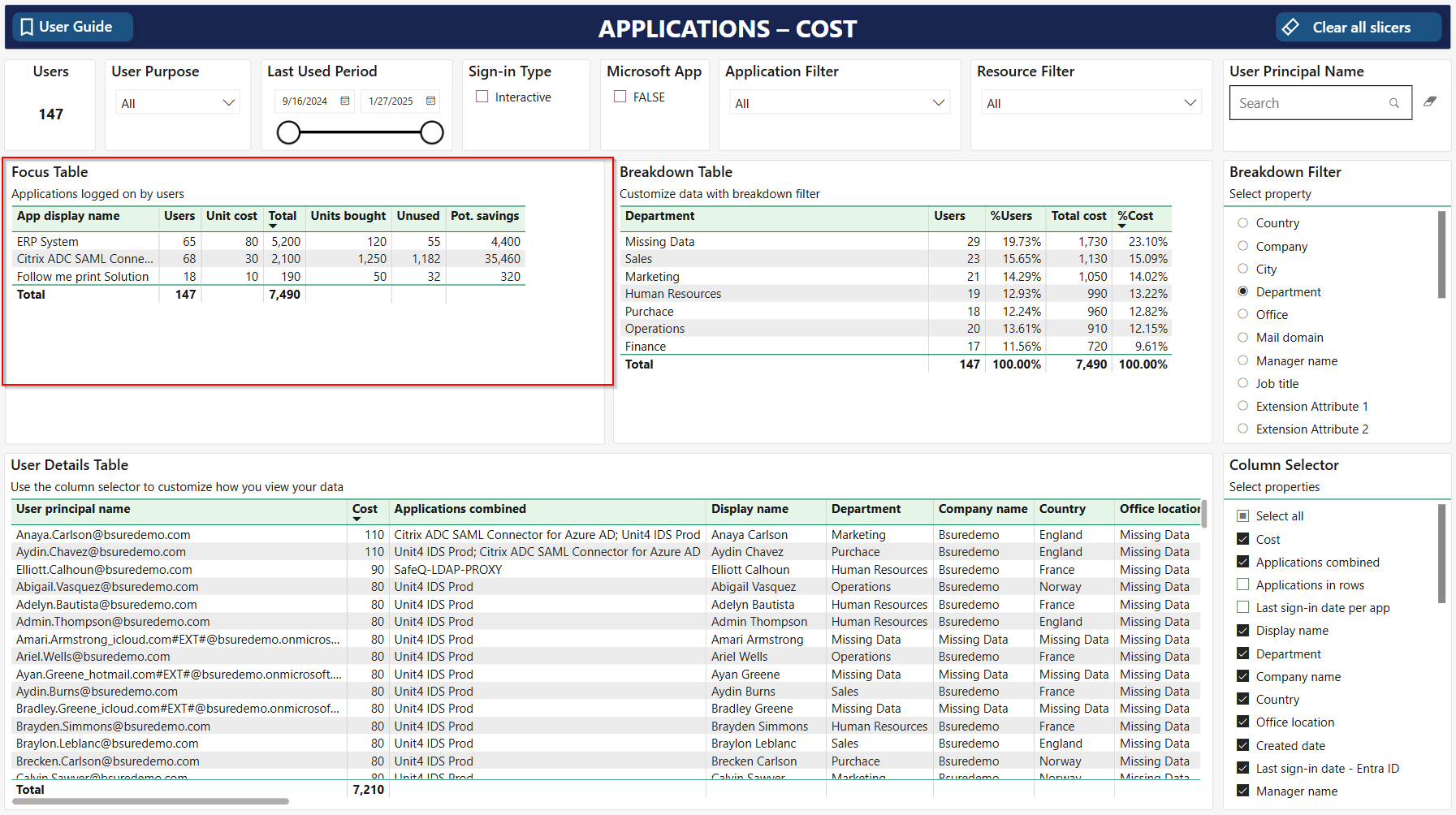 In this table you can drill down on the specific users and which applications they have been authenticated towards since Bsure was installed, and which cost that application has