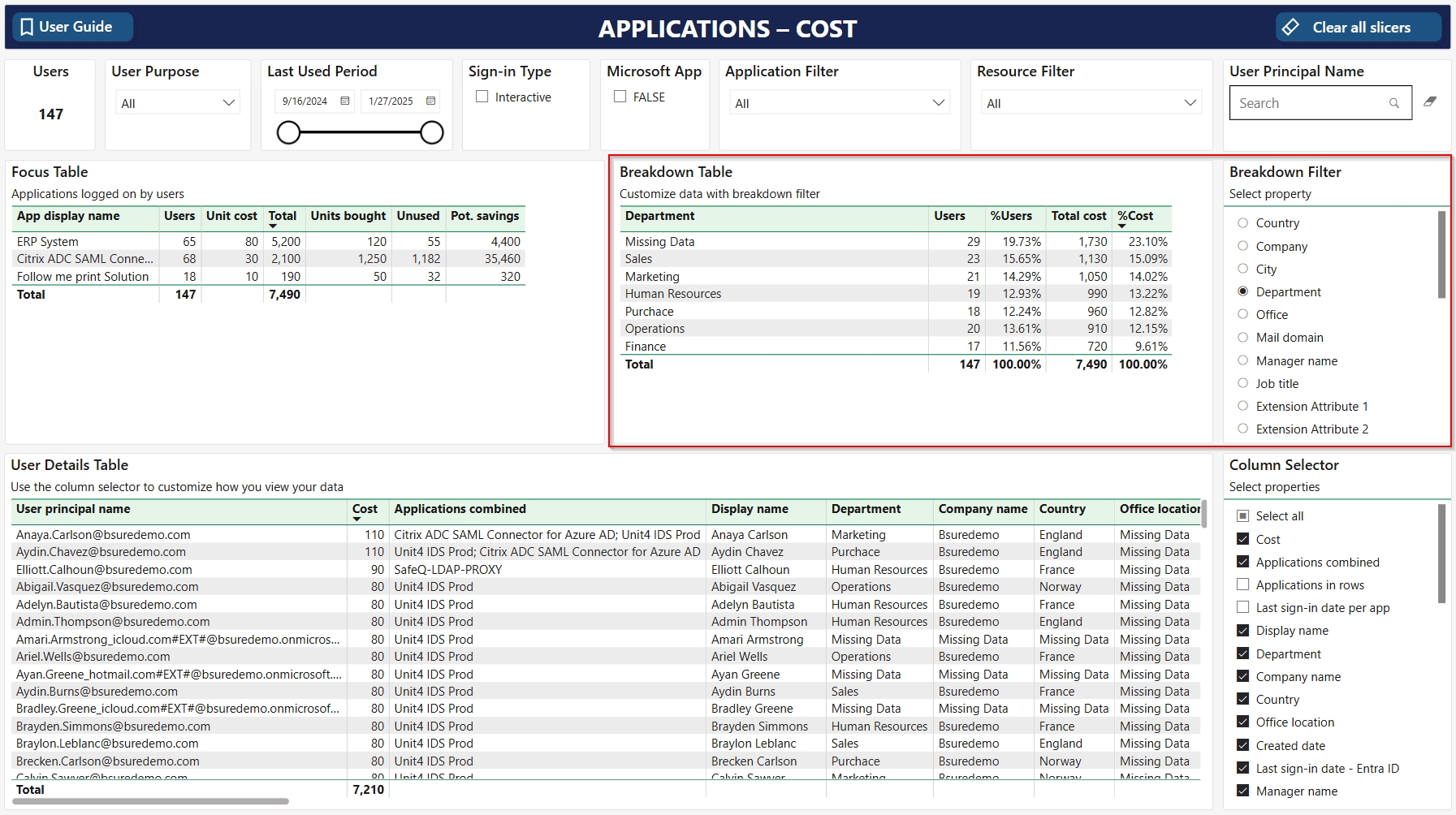 - In this table you can drill down on the specific users and which applications they have been authenticated towards since Bsure was installed, and which cost that application has