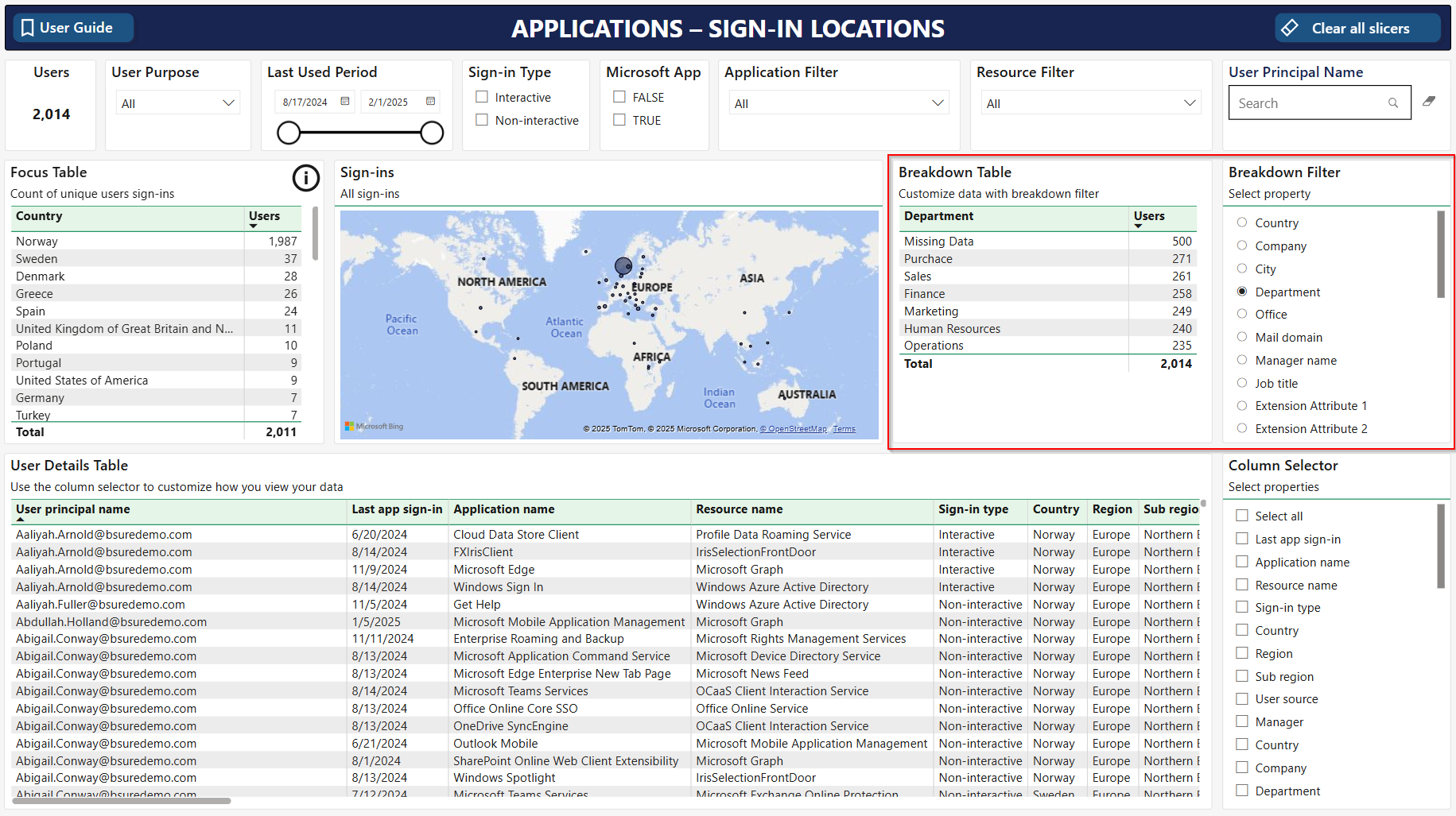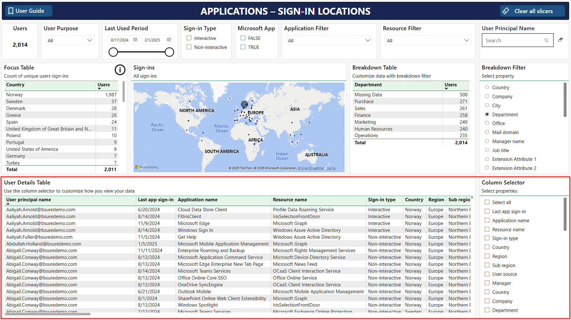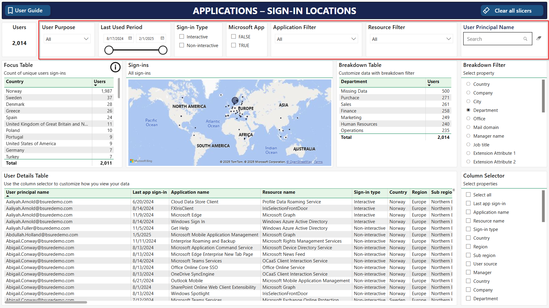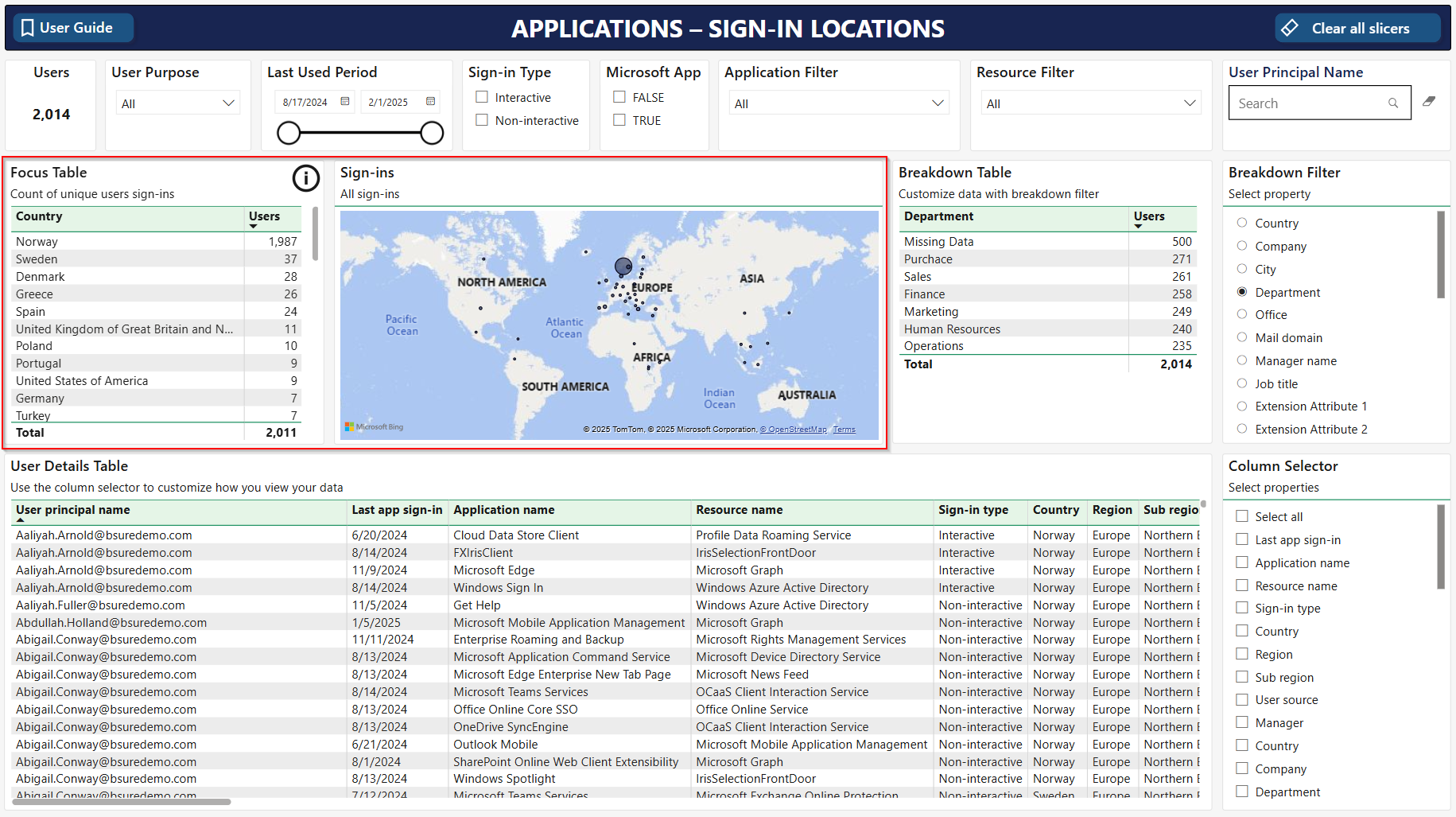 * In the focus table we display unique sign-ins to the chosen applications in different countries. On the right side there is a map showing the sign-ins in the different countries with blue dots.