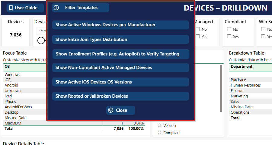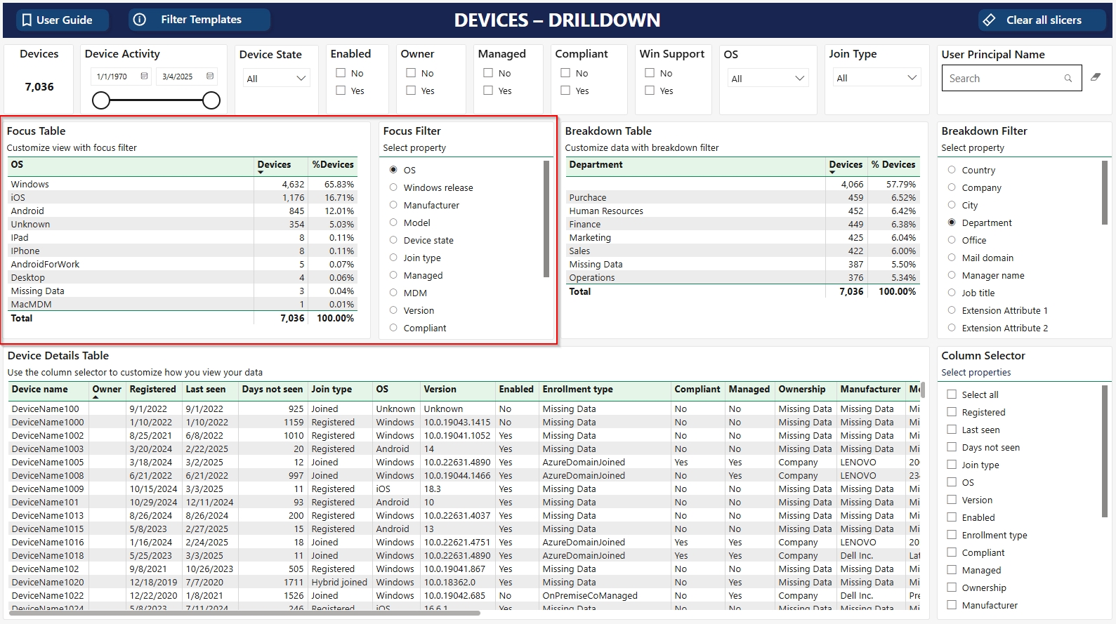 Analyze devices in Microsoft Entra ID with customizable focus areas for flexible insights.