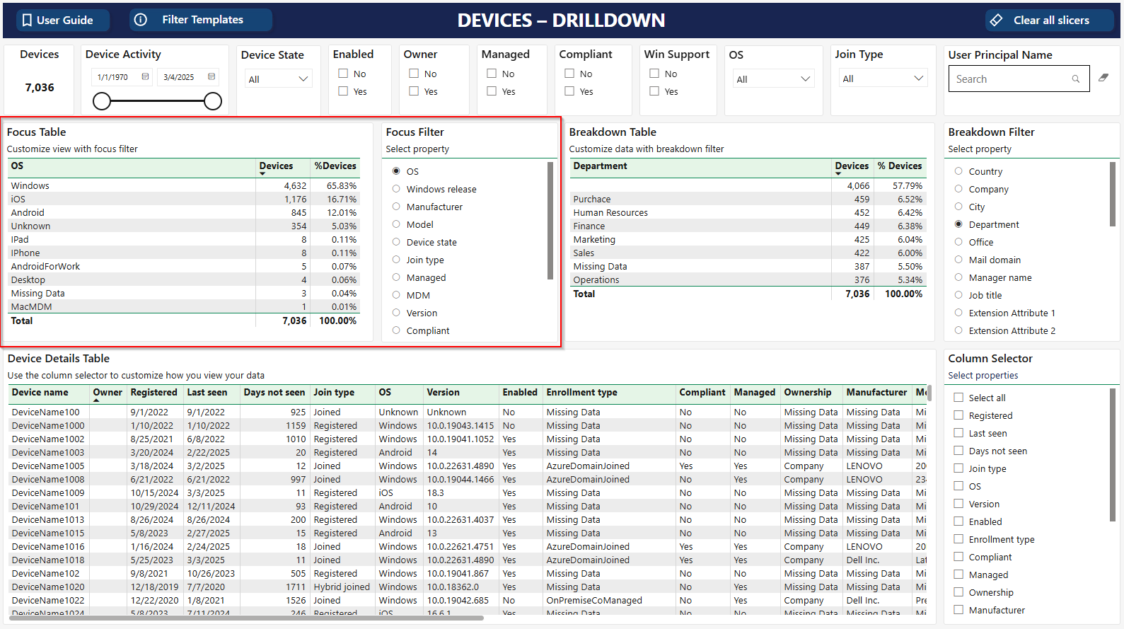 The report provides a flexible summary of devices based on a selected focus area, with detailed device information.