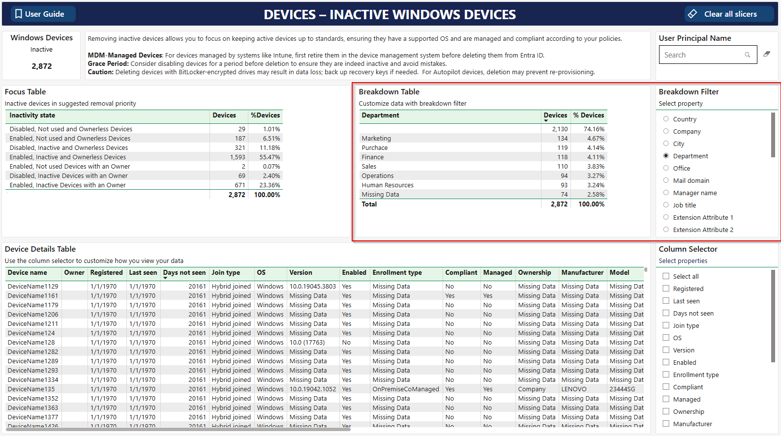 The Windows Inactive Devices report displays details for Windows devices in your Microsoft Entra ID environment that have had no activity in the last 90 days. Use this report to identify and remove stale devices to reduce security risks and optimize your device management.