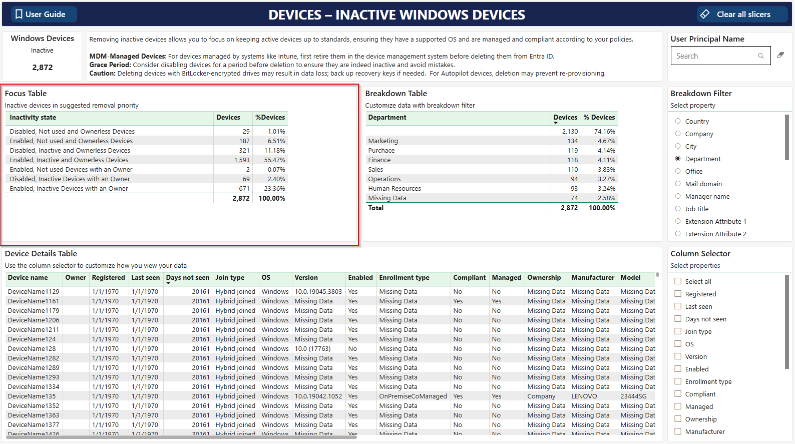 1. **Review Removal Priority**: Use the Focus Table to identify high-priority devices, such as "Disabled, Not Used and Ownerless Devices" or "Enabled, Not Used and Ownerless Devices."