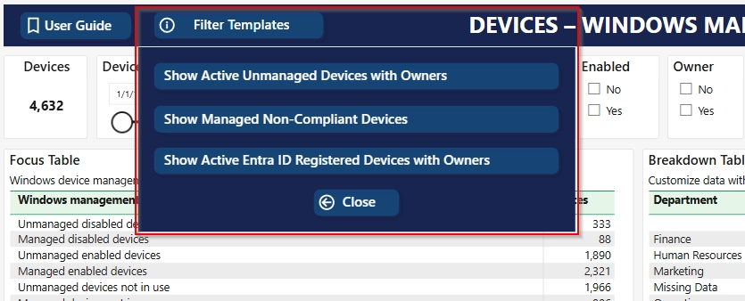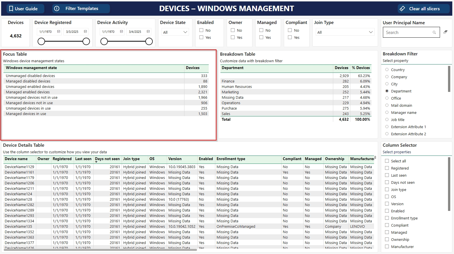 Use the Focus Table to get a quick view on the different Windows management states of your devices: