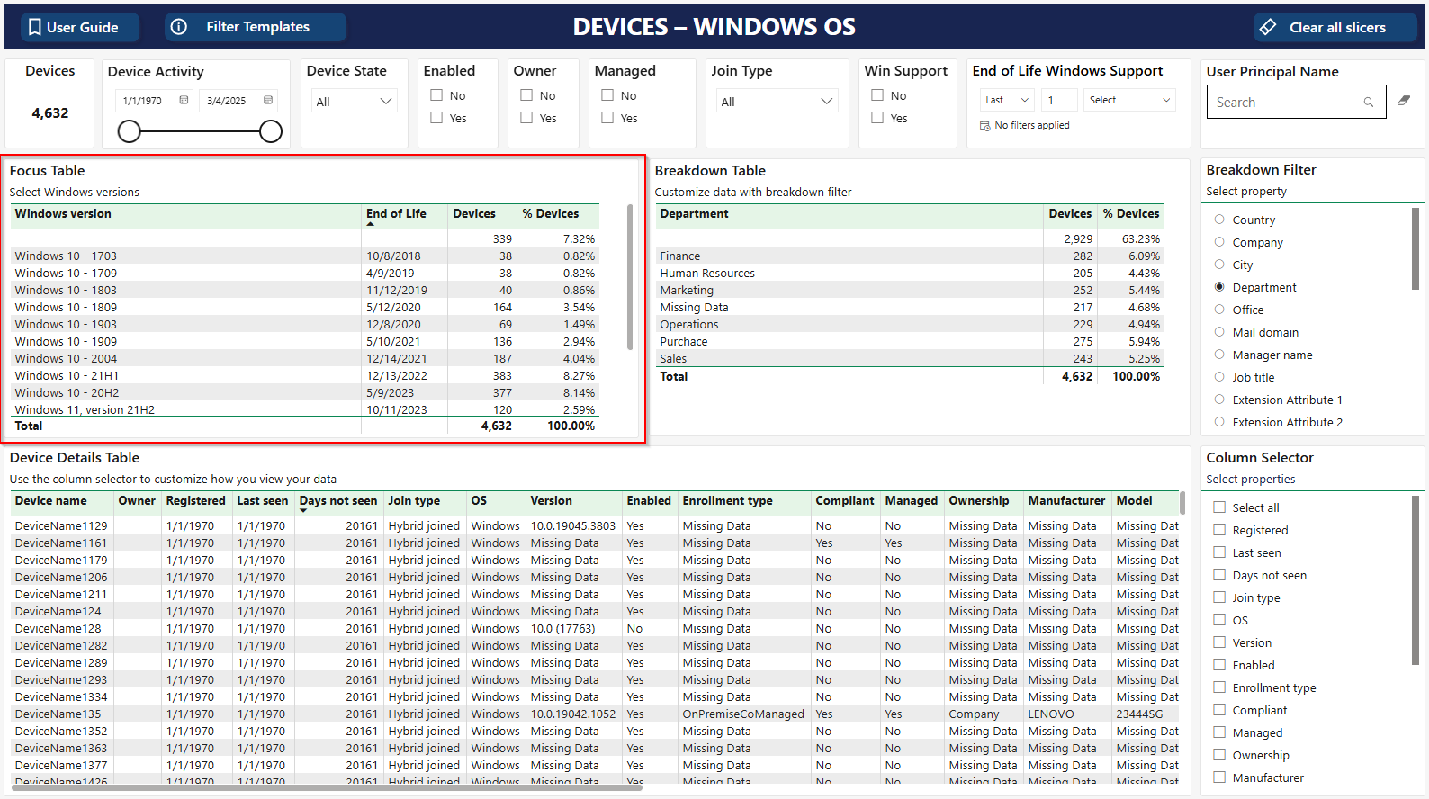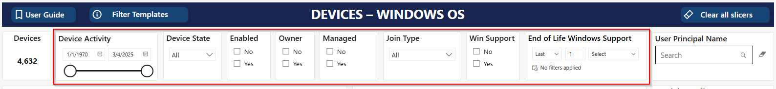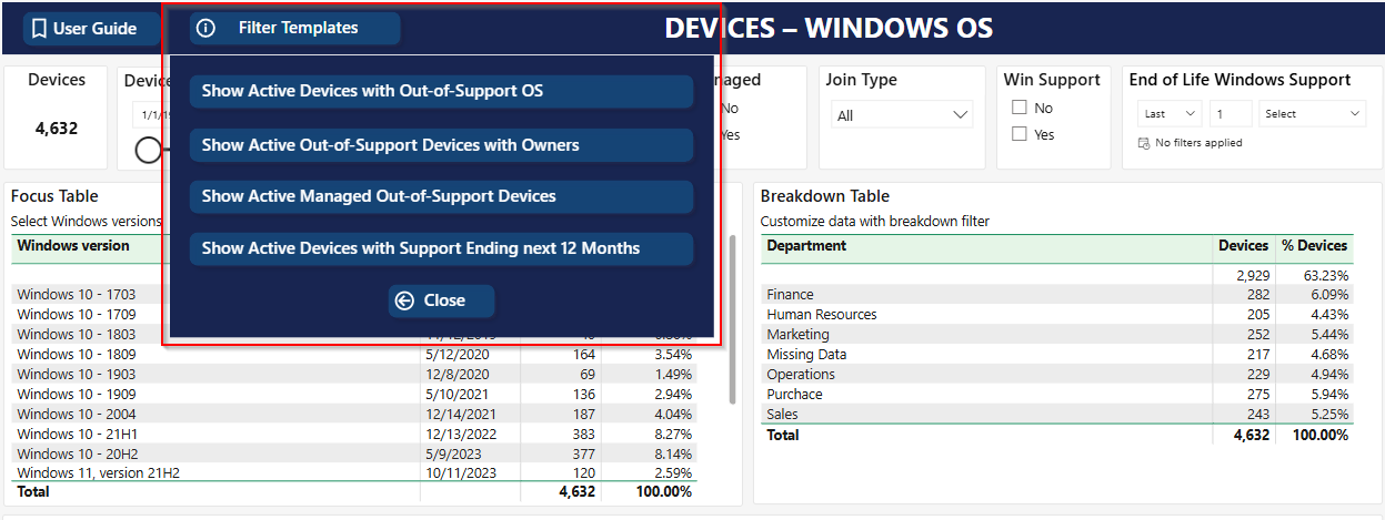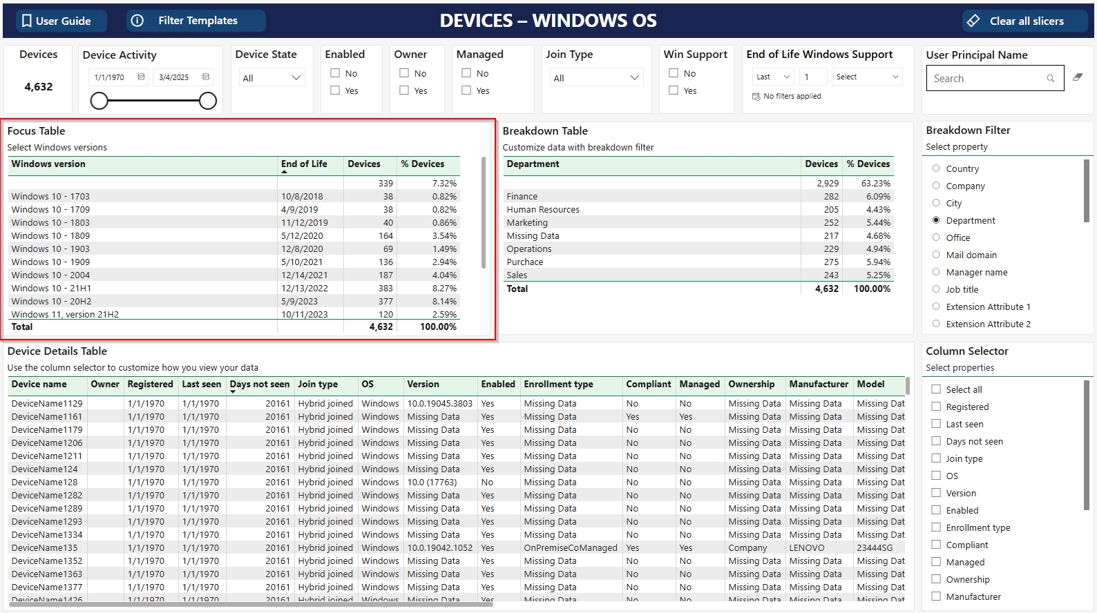 The Windows OS report displays details for Windows devices in your Microsoft Entra ID environment. The report focuses on OS versions and their support status to help you identify devices running out-of-support Windows versions.