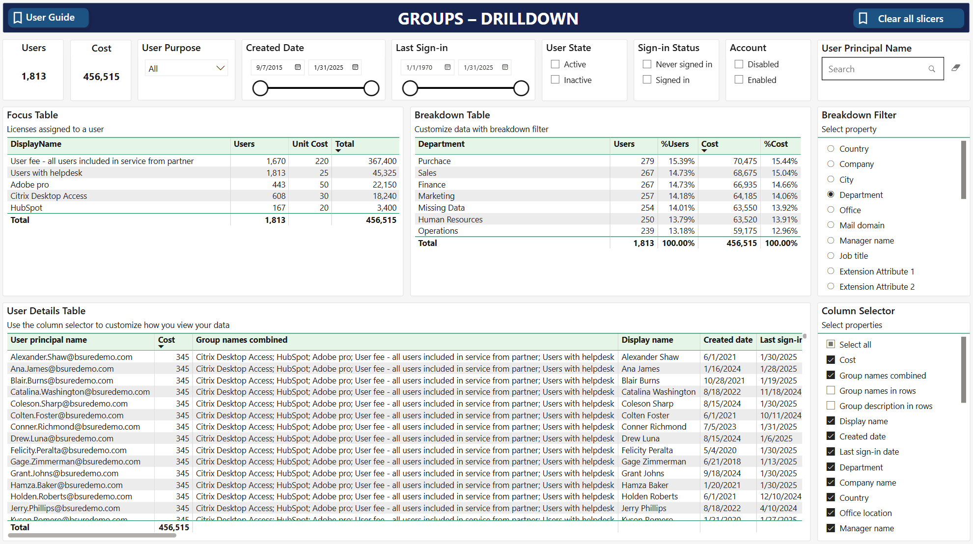The report will show You all your specified groups in the Focus table with how many users and the total cost per group. The report itself has the same setup as the other reports with a focus table, a breakdown table and a user details table