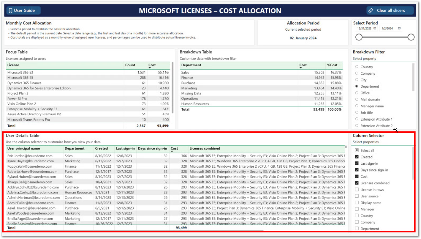 The cost allocation report gives you the opportunity to allocate licenses All tables in this report is interactive and if you filter/click on one object the other tables will respond to this&#x20;