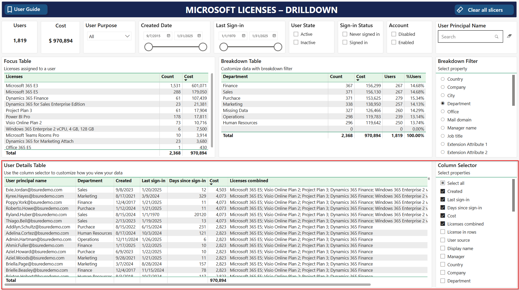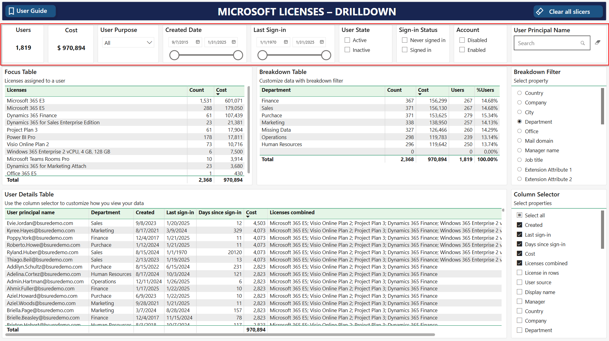 In this report we combine the information from the previous reports and give you the chance to drill down on all user- and license specific data&#x20;