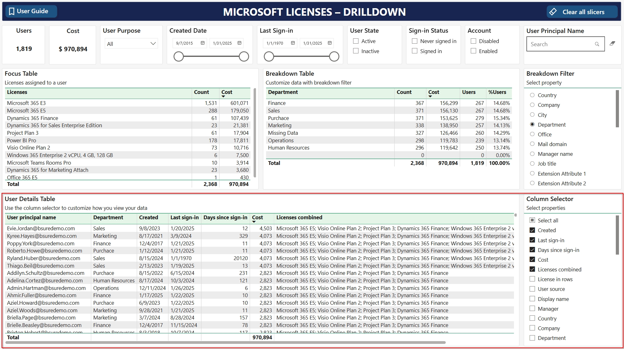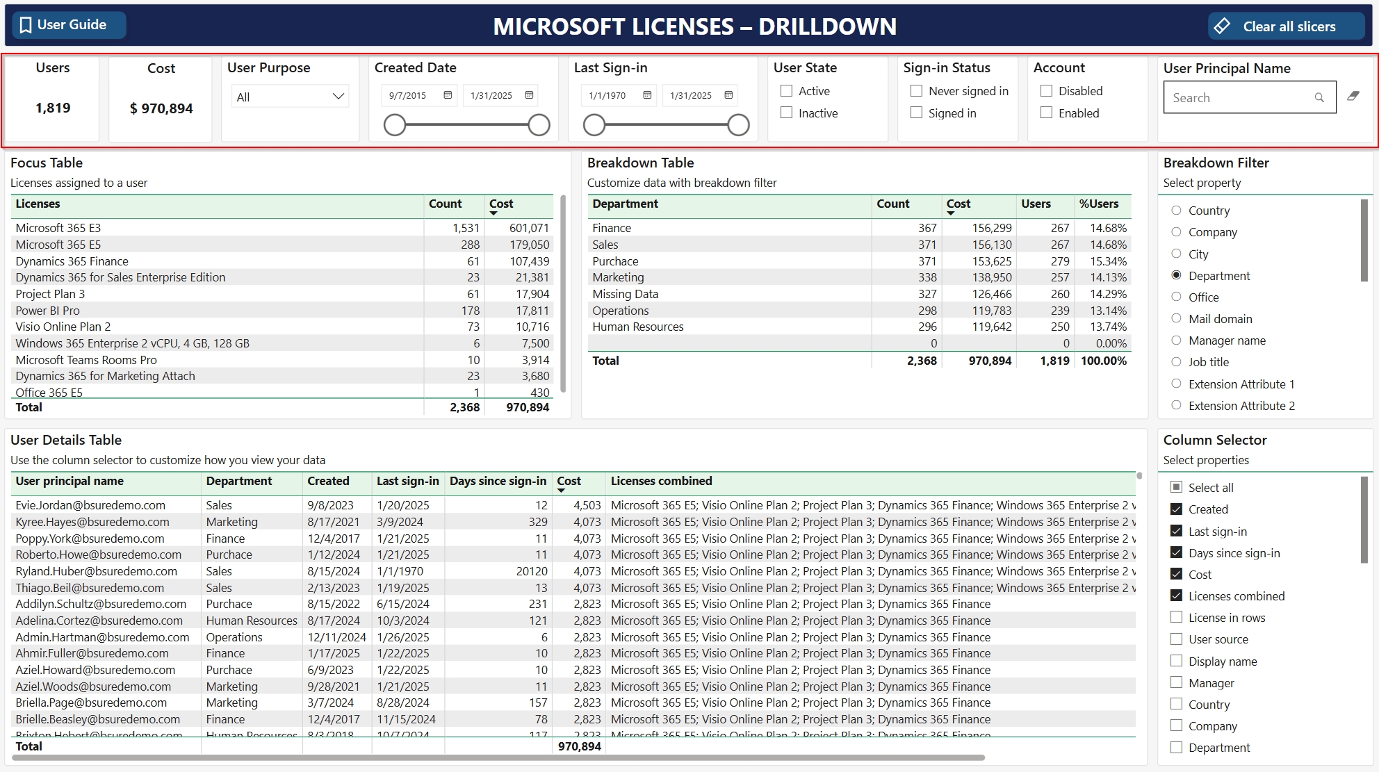 In this report we combine the information from the previous reports and give you the chance to drill down on all user- and license specific data