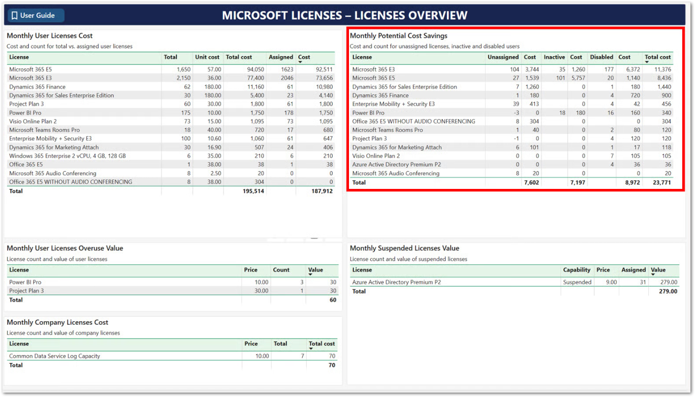 * Details potential savings from unassigned licenses, inactive, and disabled users.&#x20;