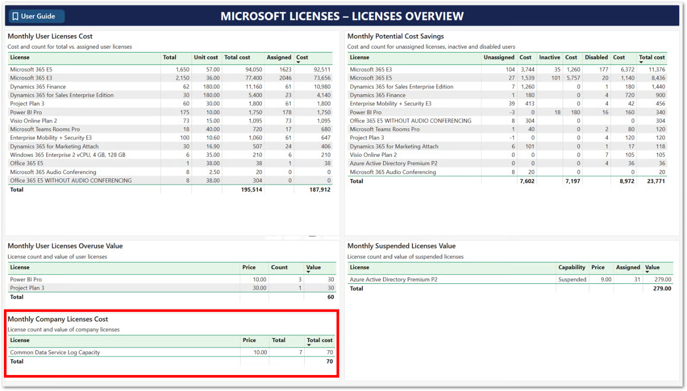 * **Inactive Licenses:** Licenses assigned to users inactive for over 90 days. Consider downgrading or removing these licenses.&#x20;