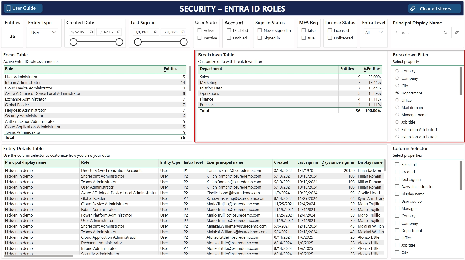 This table shows the distribution of roles for the chosen user property in the breakdown filter. If a line is blank it means that this is a service principal or a group