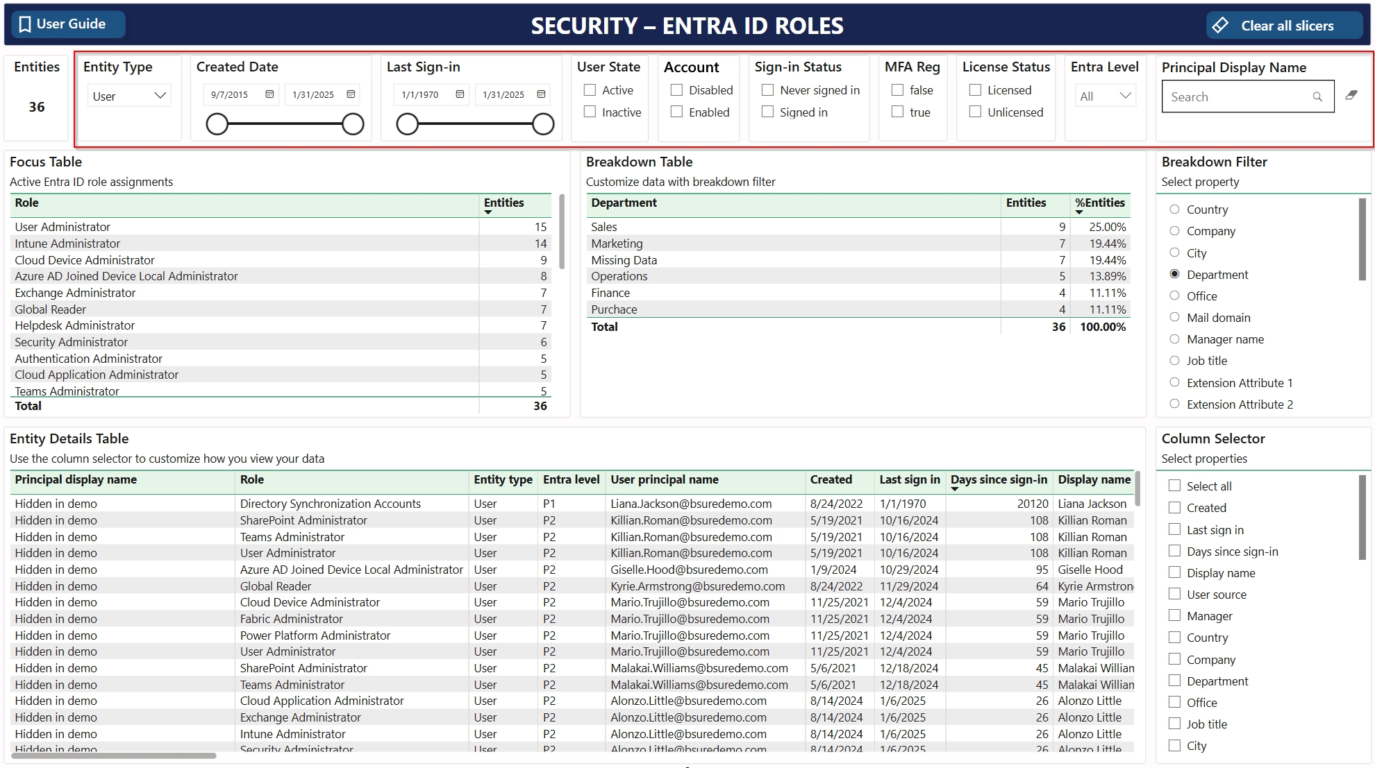 Entra Level: The Entra ID license level of the user (Free, P1, P2, Governance)