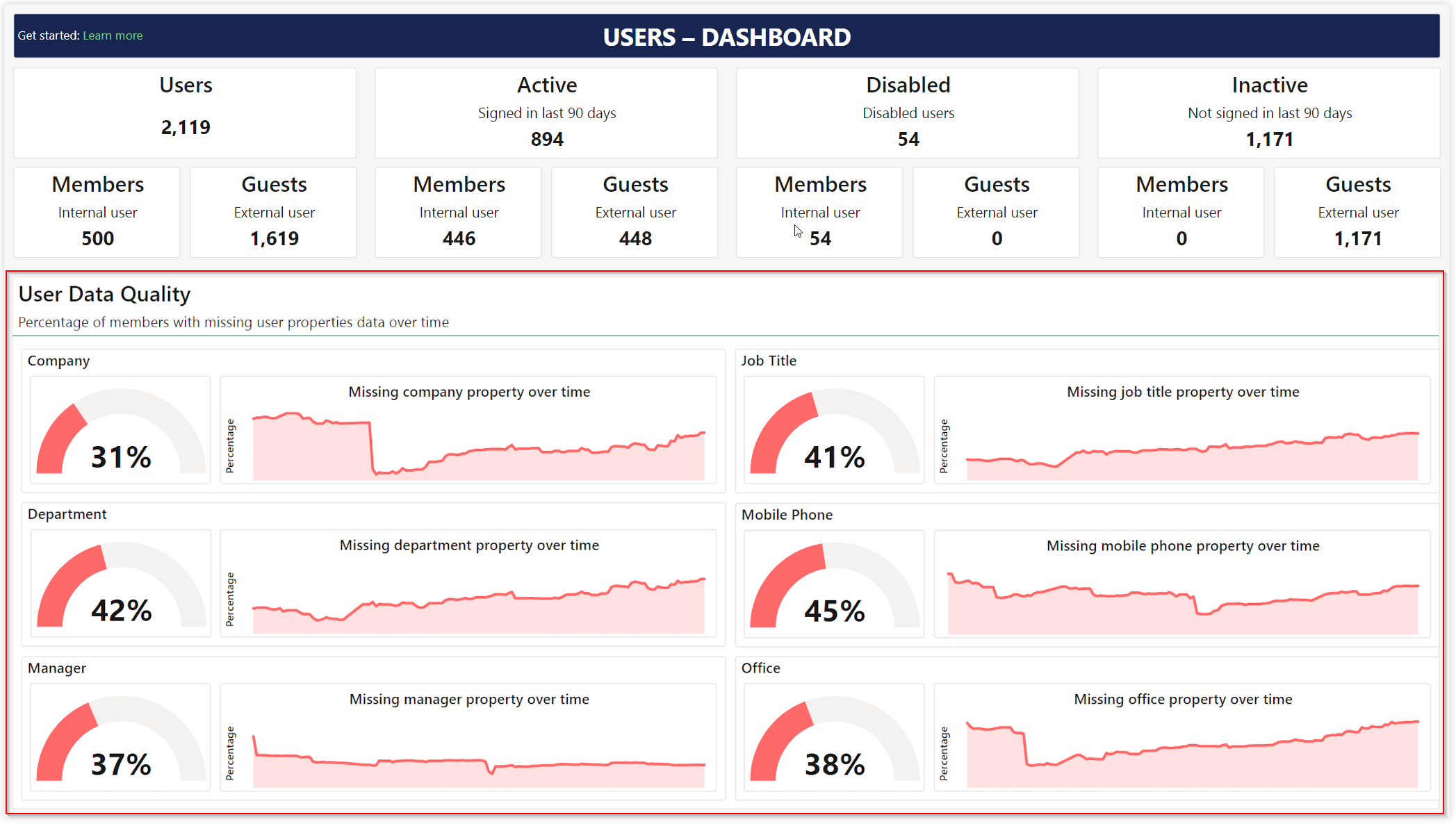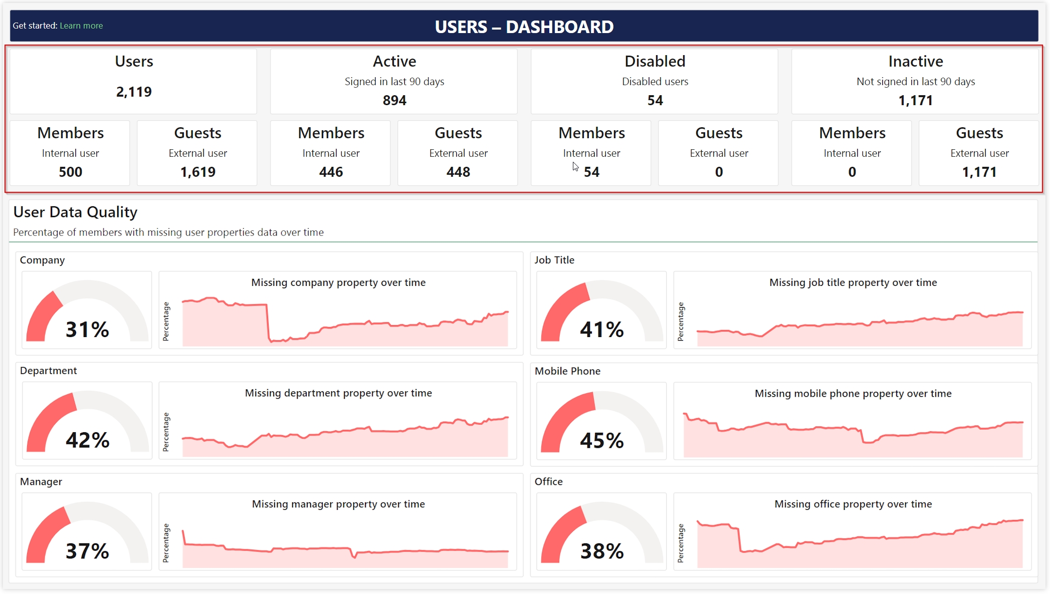 The Users Dashboard has two parts. Tiles showing your tenant's users - types and state. And a user data quality section showing status over time for some of the most commonly used user properties.