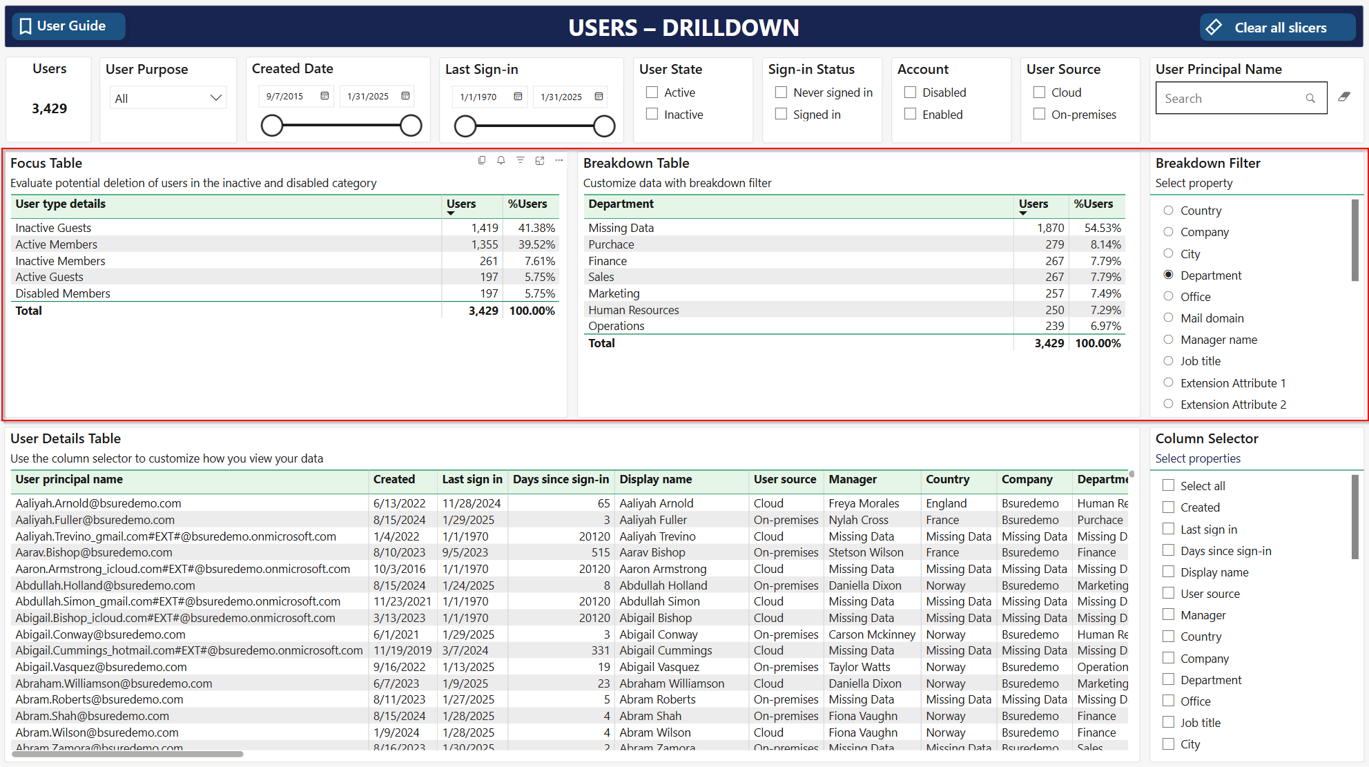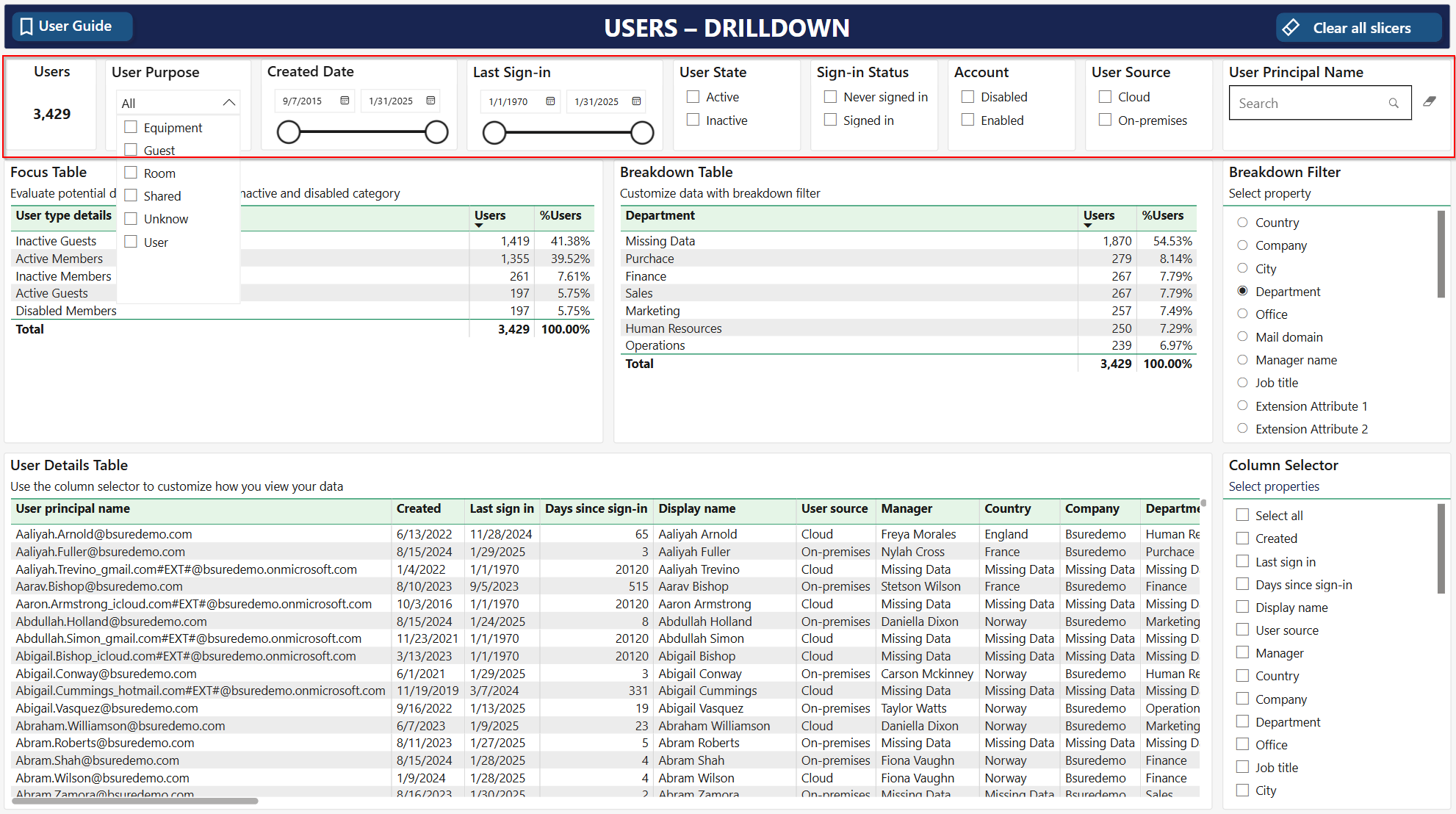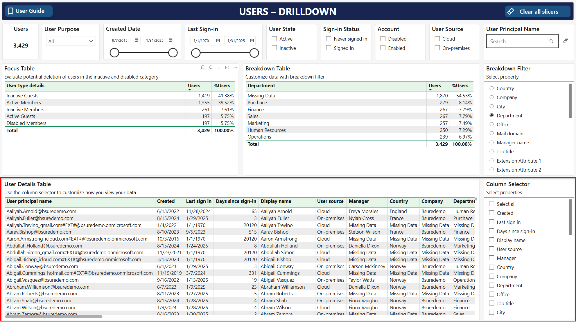 The **user details table** lists all member and guest users in scope of your filtering selection. The table has a default set of columns. You can change these to your preferences using the **column selector**.&#x20;