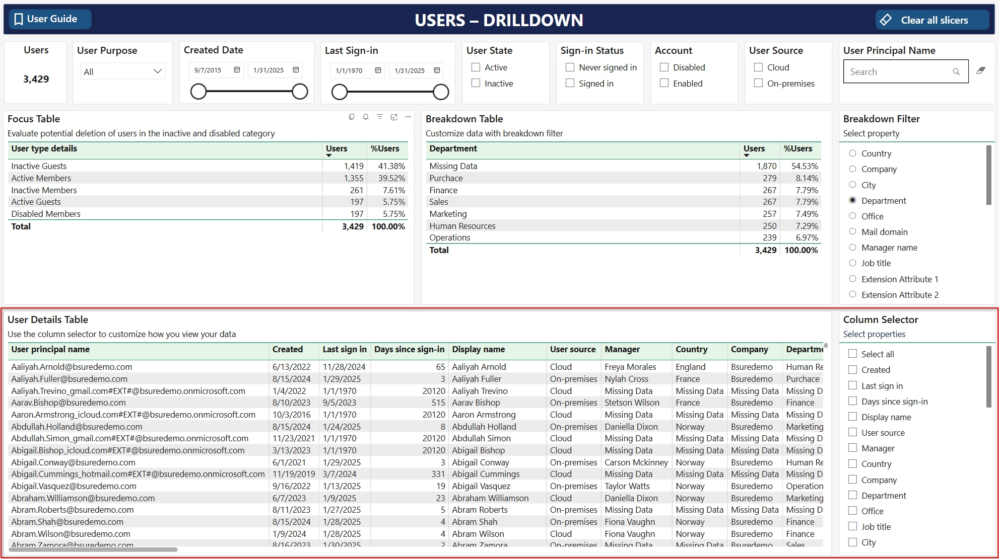The user details table lists all member and guest users in scope of your filtering selection. The table has a default set of columns. You can change these to your preferences using the column selector.