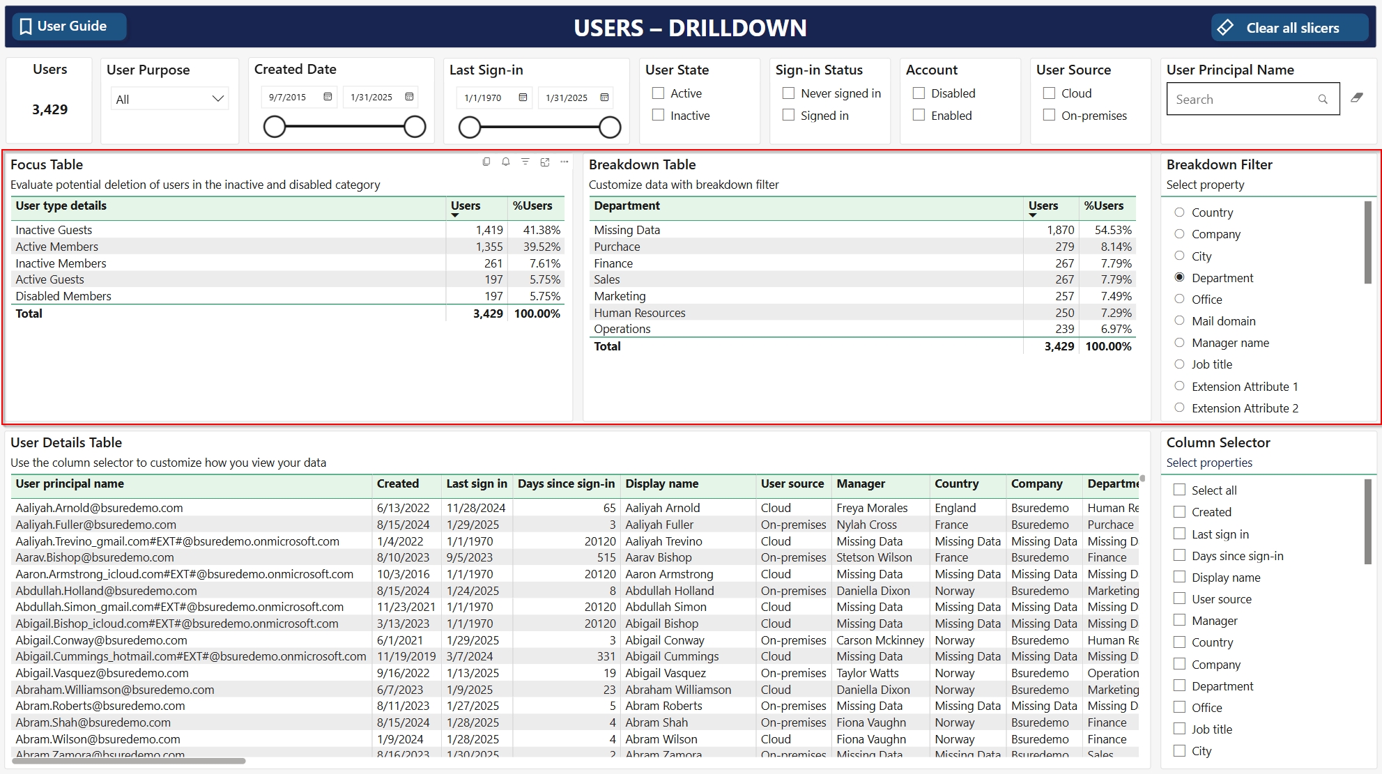 Focus Table: The focus table shows the distribution of Active, Inactive and Disabled member and guest accounts in your tenant.