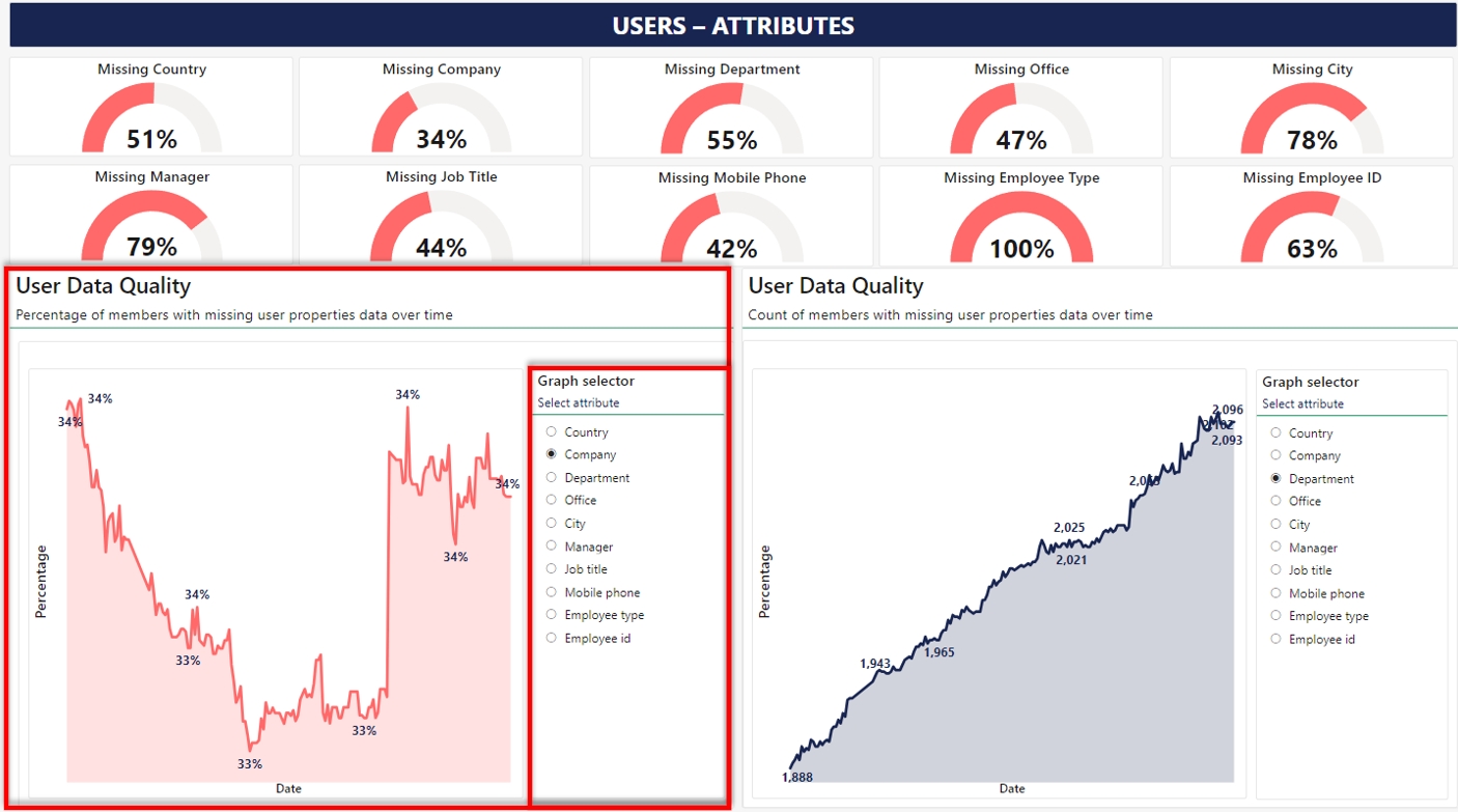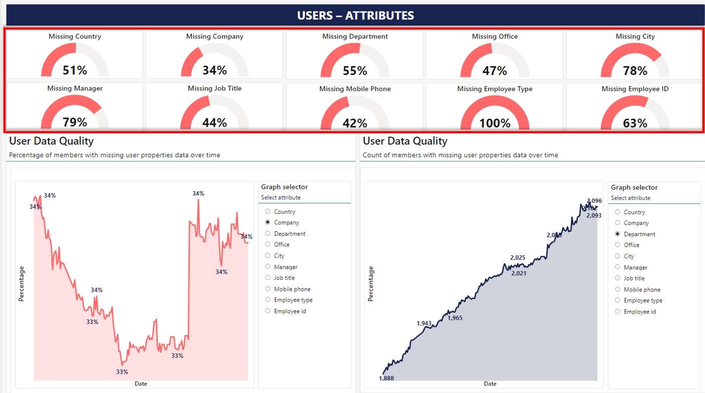 The graph to the right shows how many users missing data of the property selected in the graph selector over time.