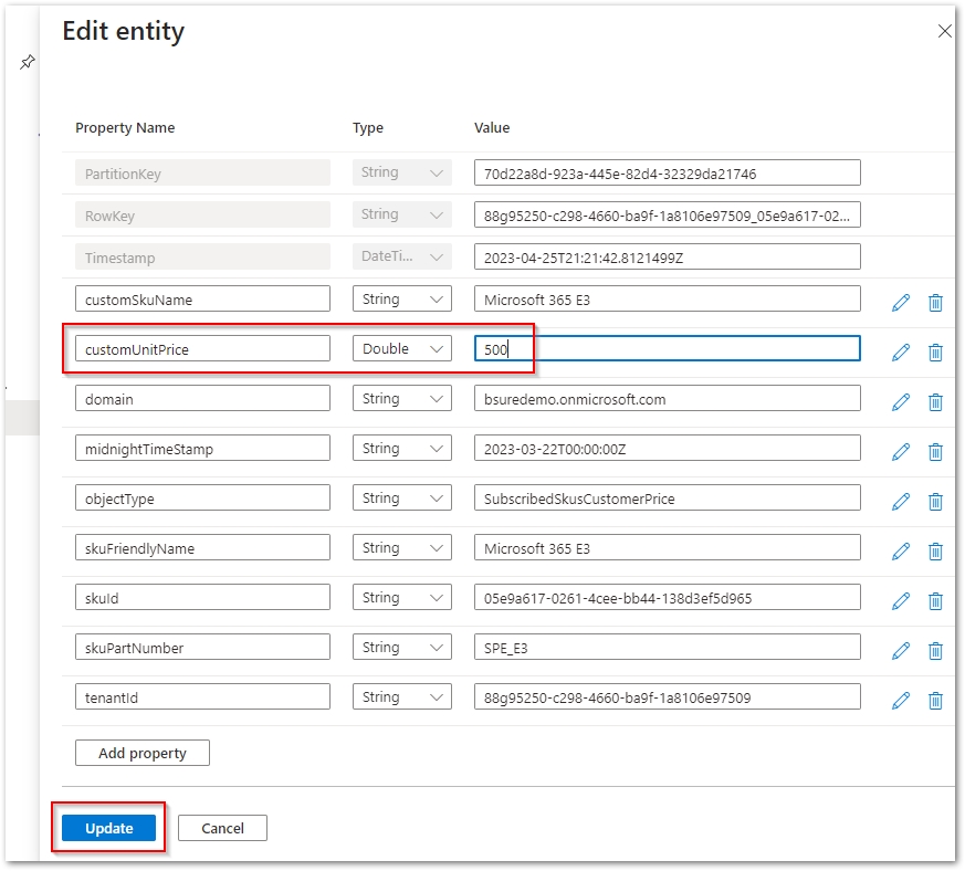 Verify that you can see the prices you added to the customUnitPrice column in the TblCustomerSkuPrices table.