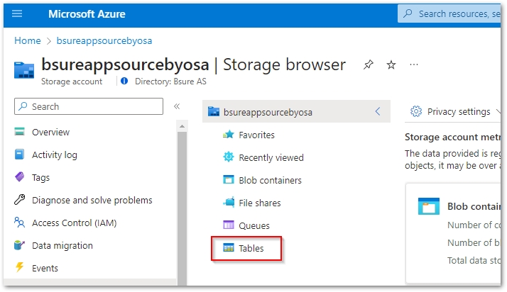 Go to the Azure portal, and locate the Storage Account you set up as one of the prerequisites when you installed the Azure Managed Application. It is the Storage Account you used when you connected the Power Bi App to your data.