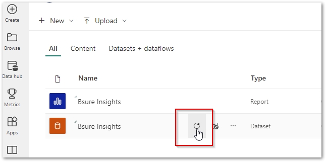 Go to your Power Bi Workspace, and select to refresh the Bsure Insights dataset.