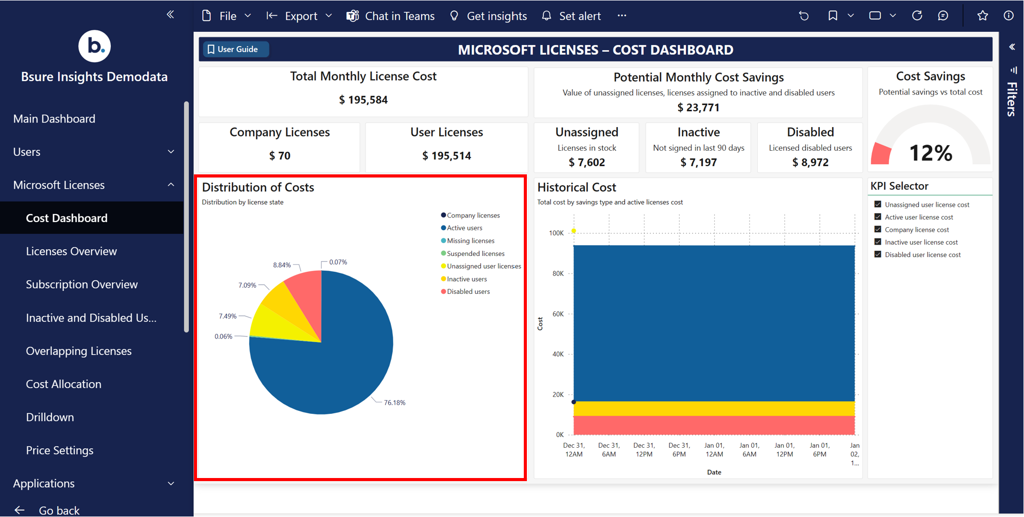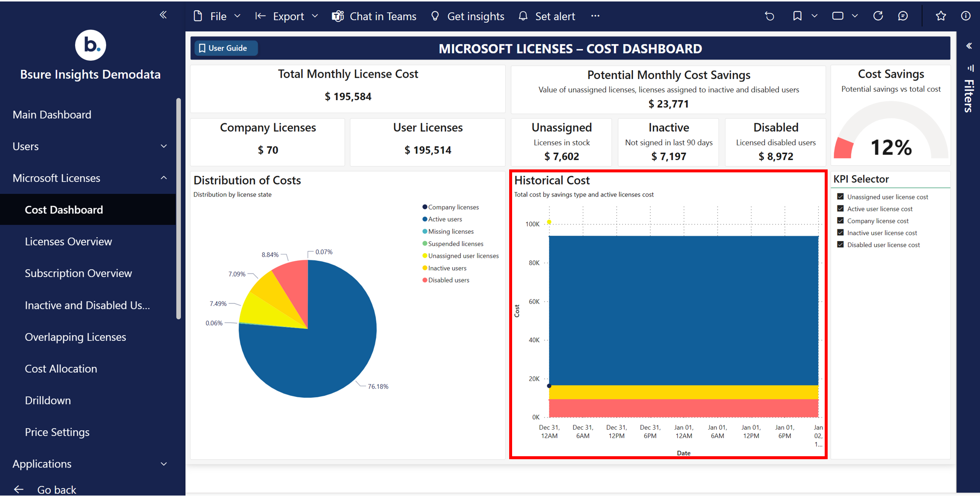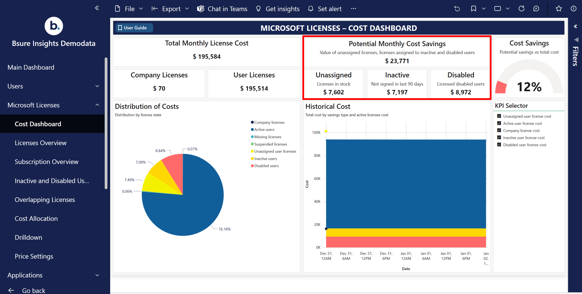 The License Cost Dashboard provides a basic overview of your total license expenses and potential monthly cost savings. In the graph on the bottom right you can see historical license utilization, and see if this has improved over time.