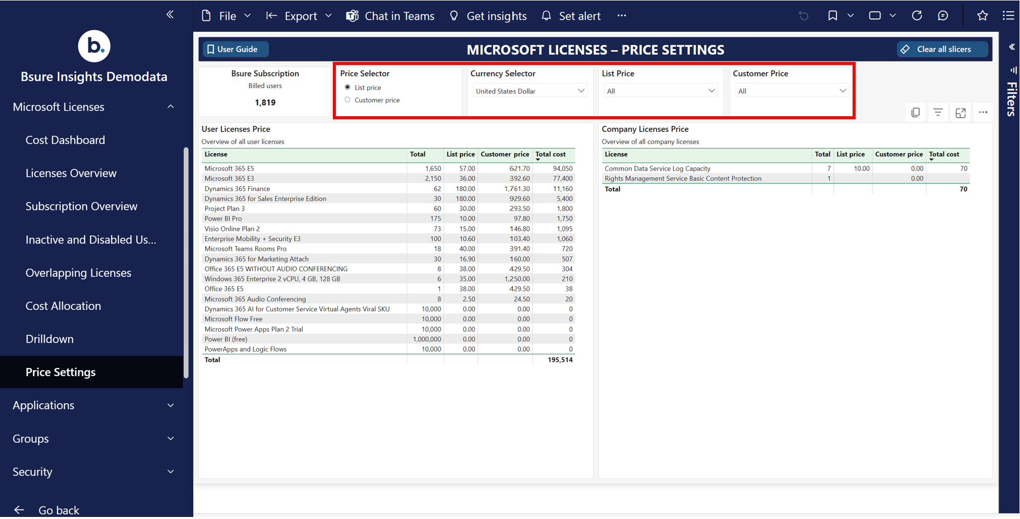 In this report you can choose whether to use Microsoft's list prices, or your own prices in your own currency when viewing your data.