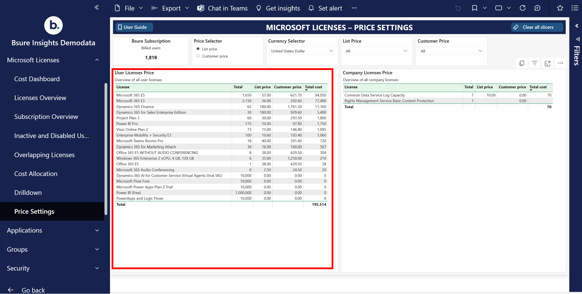 * In this table you see an overview of all your user licenses with the list price from Microsoft, and your own price if you have added them yourself