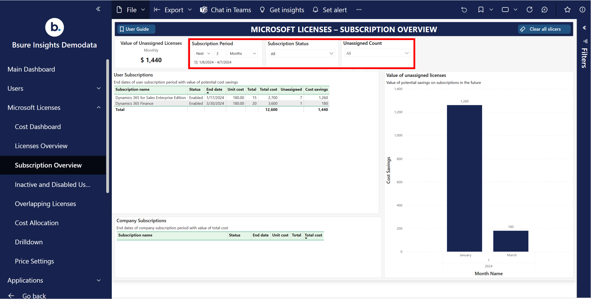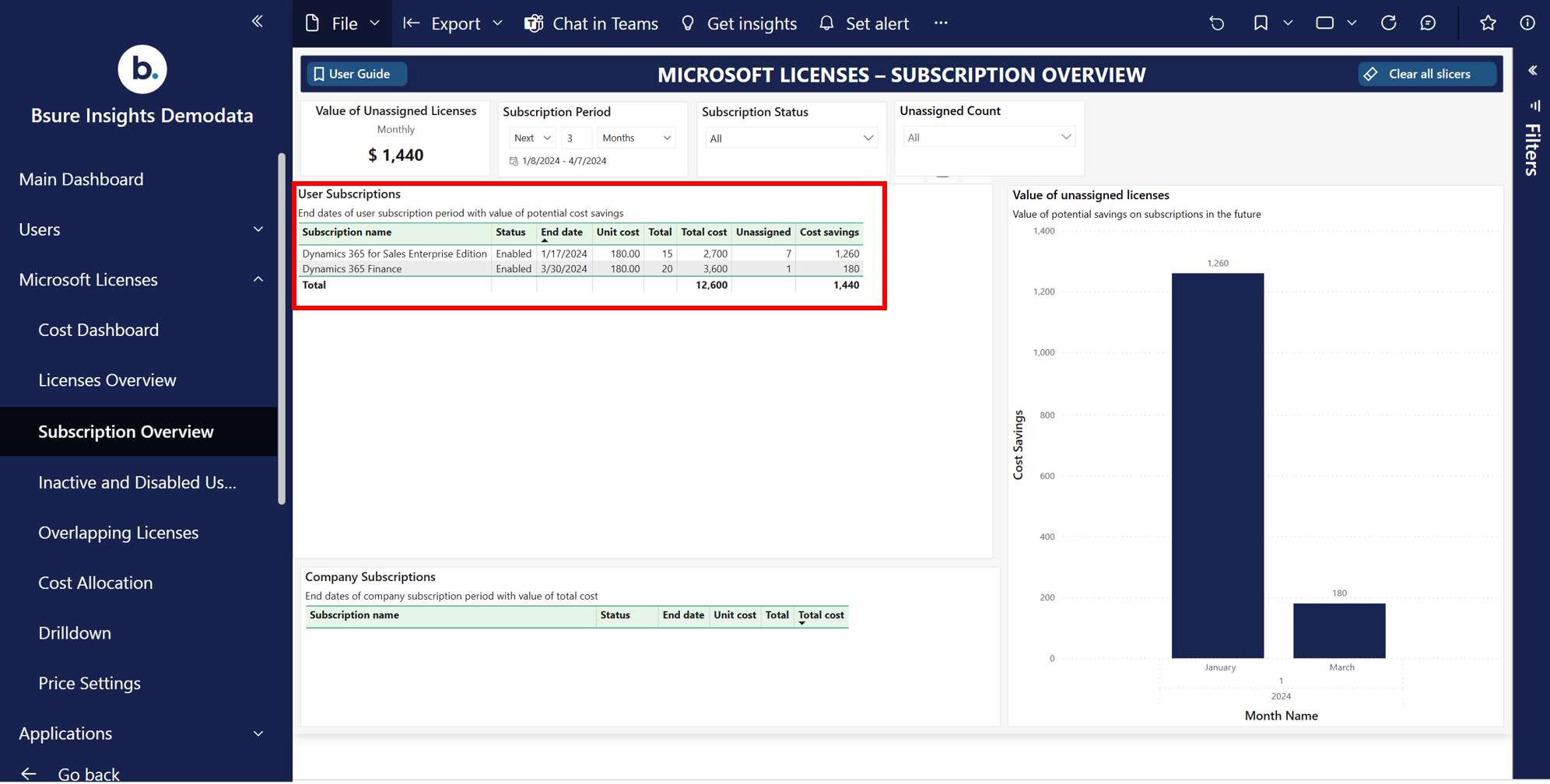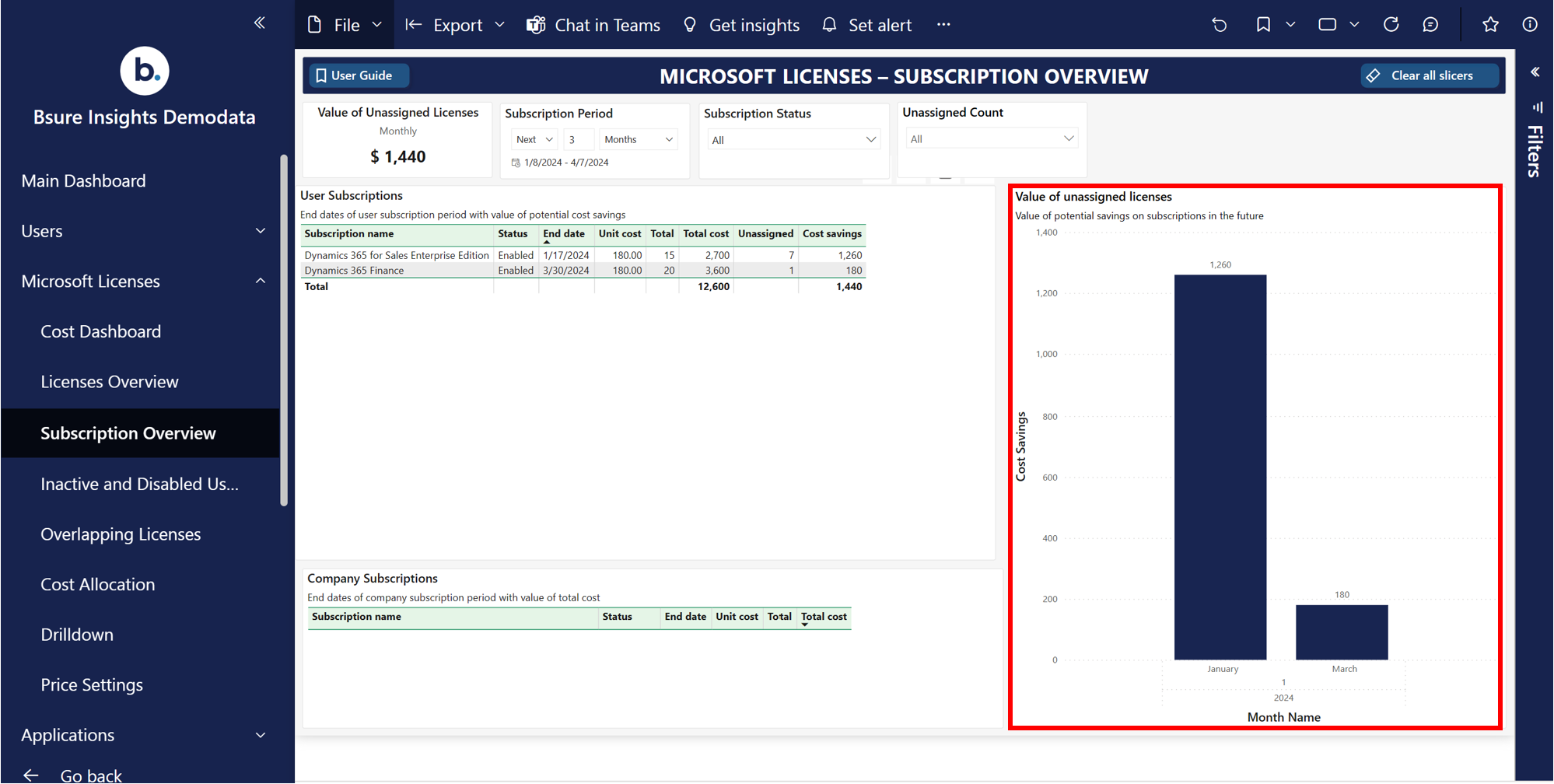 * **Tip:** Subscriptions with unassigned licenses represent potential cost savings