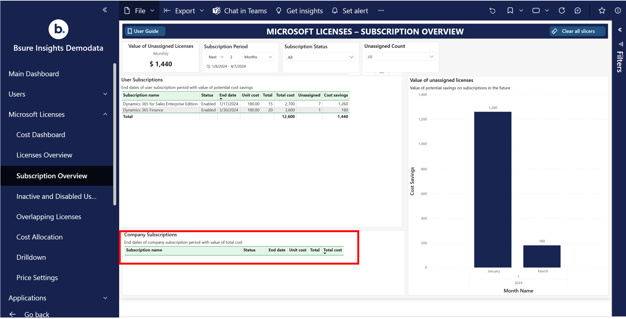 This report is designed to give you a comprehensive understanding of your Microsoft cloud subscriptions. It details the types and quantities of subscriptions you have purchased and their respective expiration dates, helping you plan ahead effectively. If you have unassigned licenses on subscriptions set to expire, don't renew them and save costs