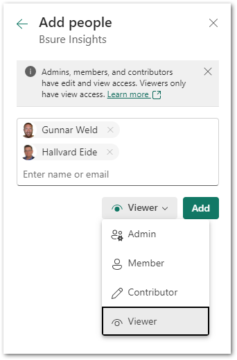 5. Add the users or groups you want to give access to. In this example I add one user with **Viewer** permissions, and one with **Admin** permissions. Select **Add**.<br>