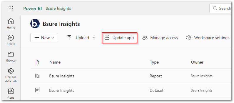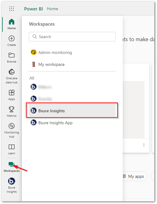 2. Select **Workspaces** in the menu, and go to the workspace where you installed **Bsure insights**.<br>